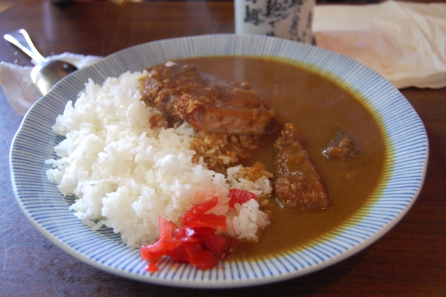 She led me outside, then, where as usual the restaurant had models of every dish it served, showing how much and what kind of food was on each. There were dishes with whole giant prawns, head and all, staring at us through the tempura batter; dishes with lotus root and peppers and other tempura, often with noodles; and the many dishes with that bland brown curry that I came to love in Japan. She began pointing to them, using simple question-words like “kochi?” After a moment, I realized that I should simply pick one and point to it. I pointed to a dish which consisted of rice with curry, with a small bit of fried meat on top. She said, “katsu-curry.” I nodded gratefully.